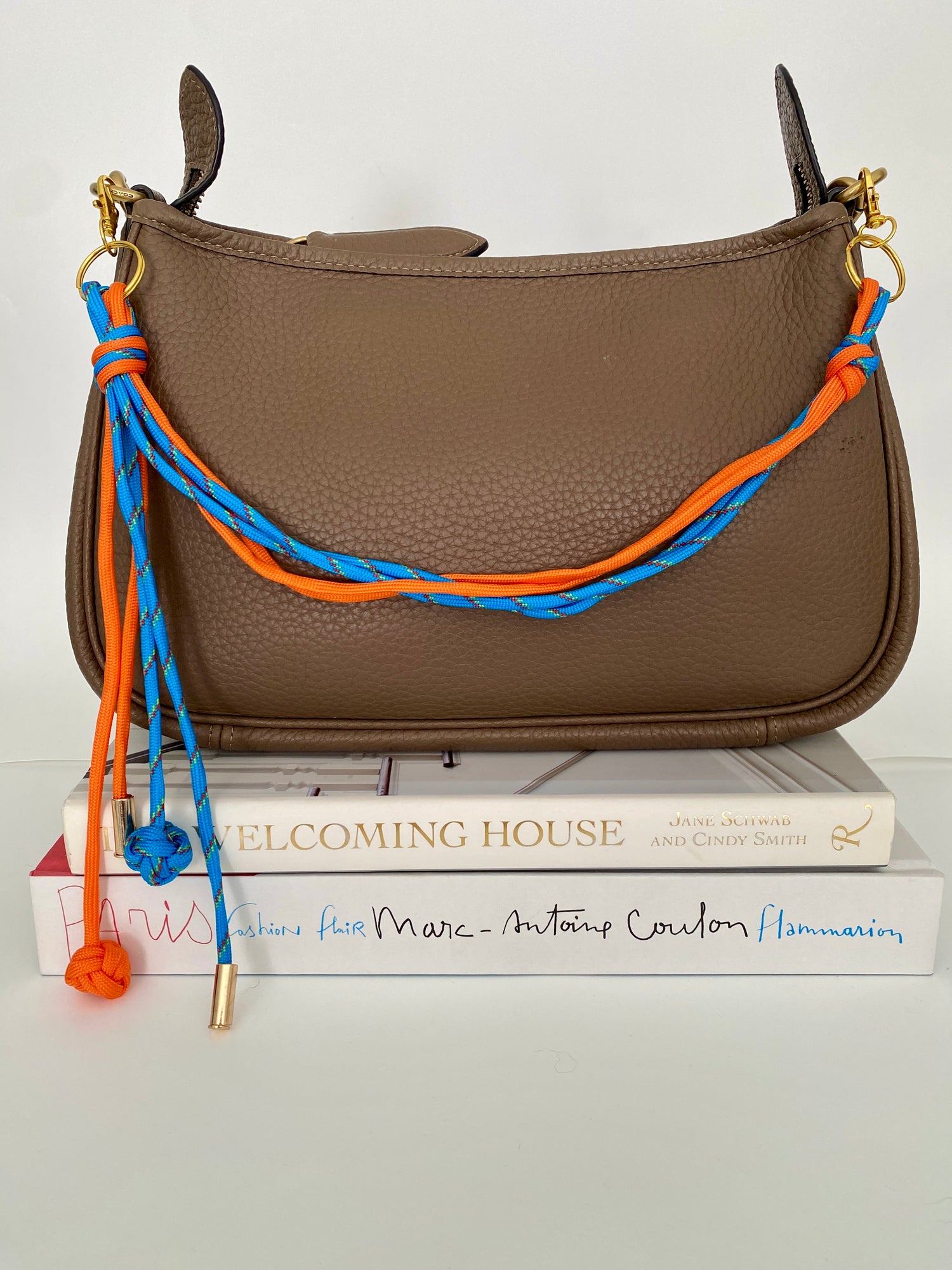 Bright braided paracord drapes across your bag strap to strap with secure hooks. Finished with a classic round knots and sleek gold caps for a playful yet polished touch.