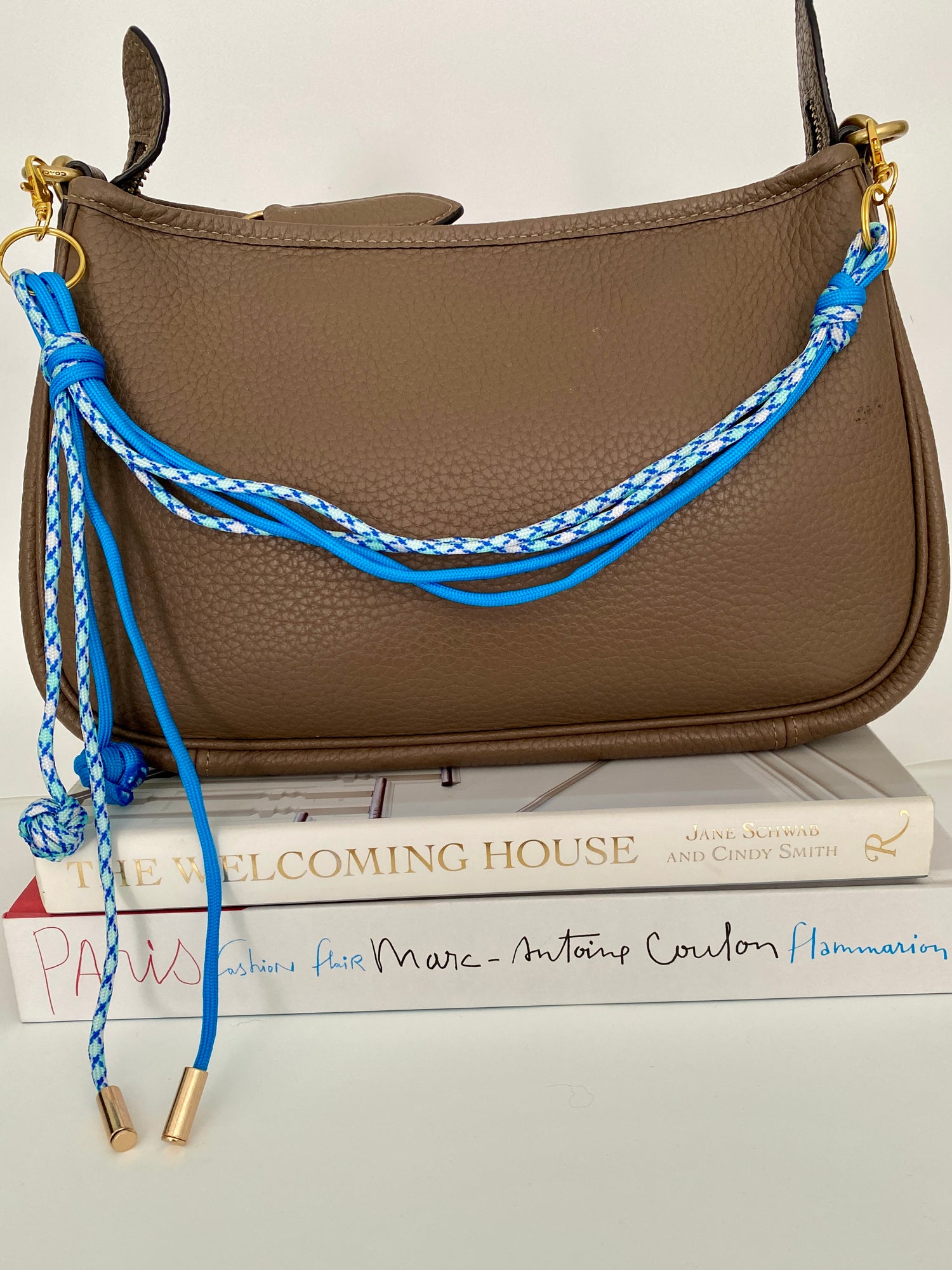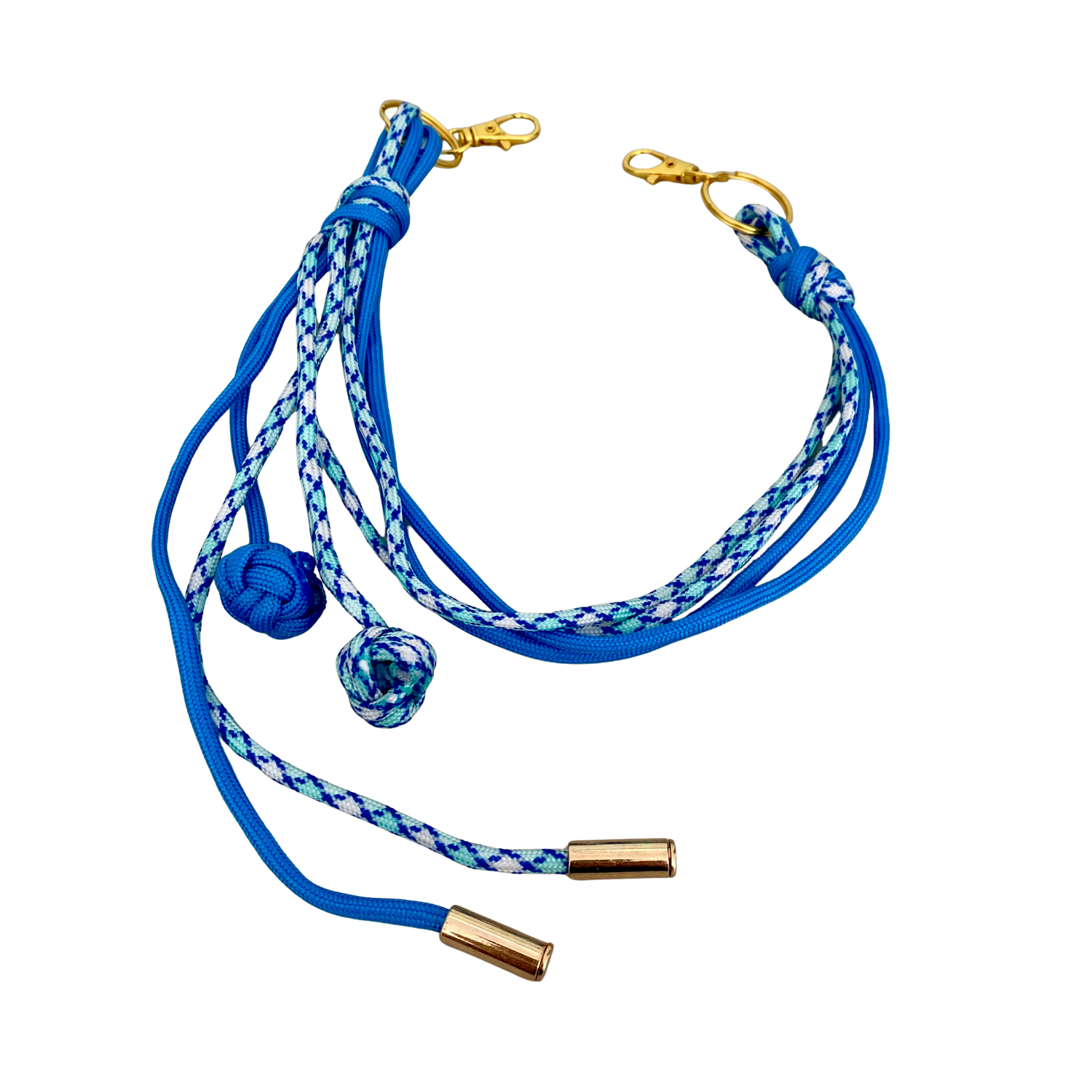 Bright braided paracord drapes across your bag strap to strap with secure hooks. Finished with a classic round knots and sleek gold caps for a playful yet polished touch.