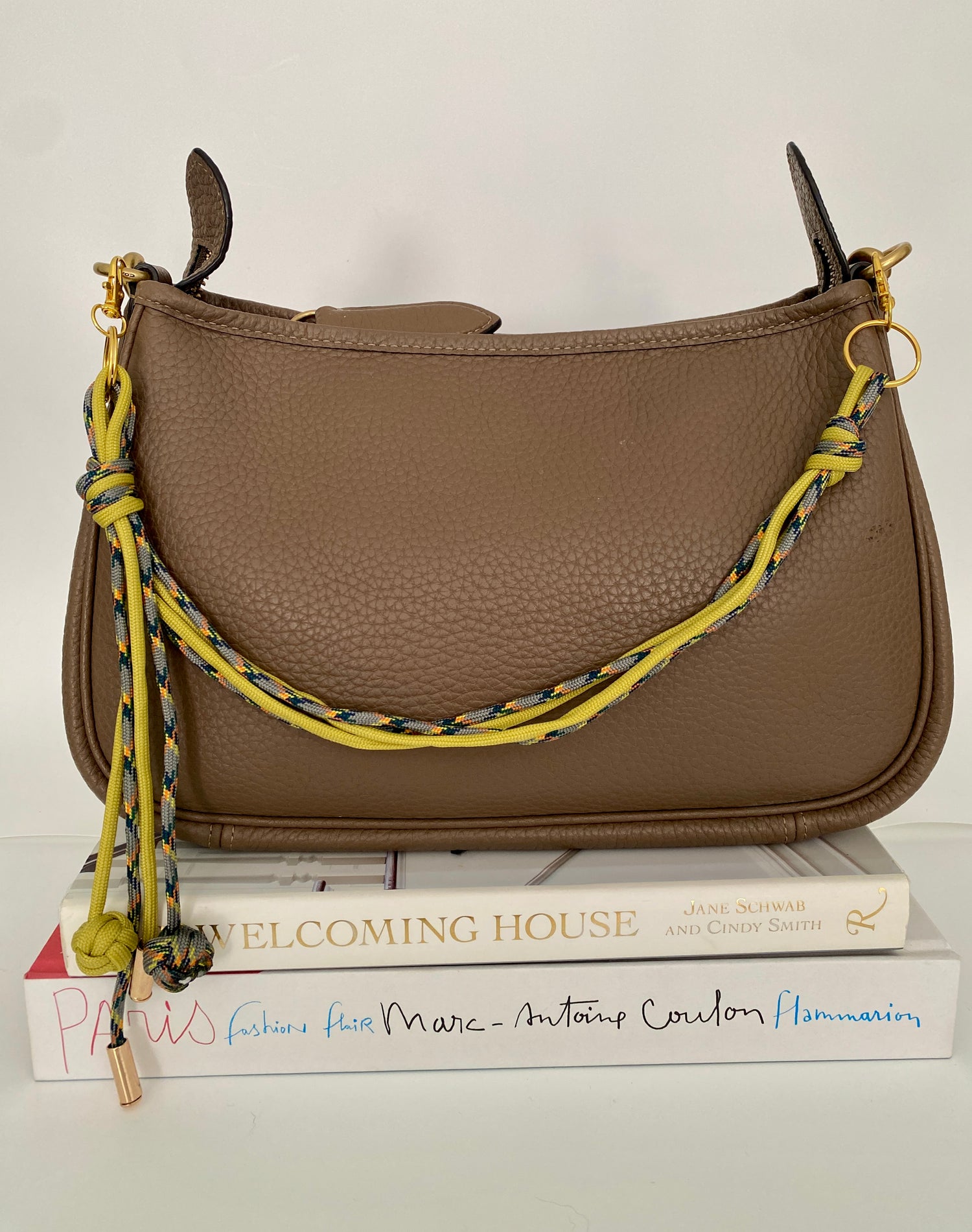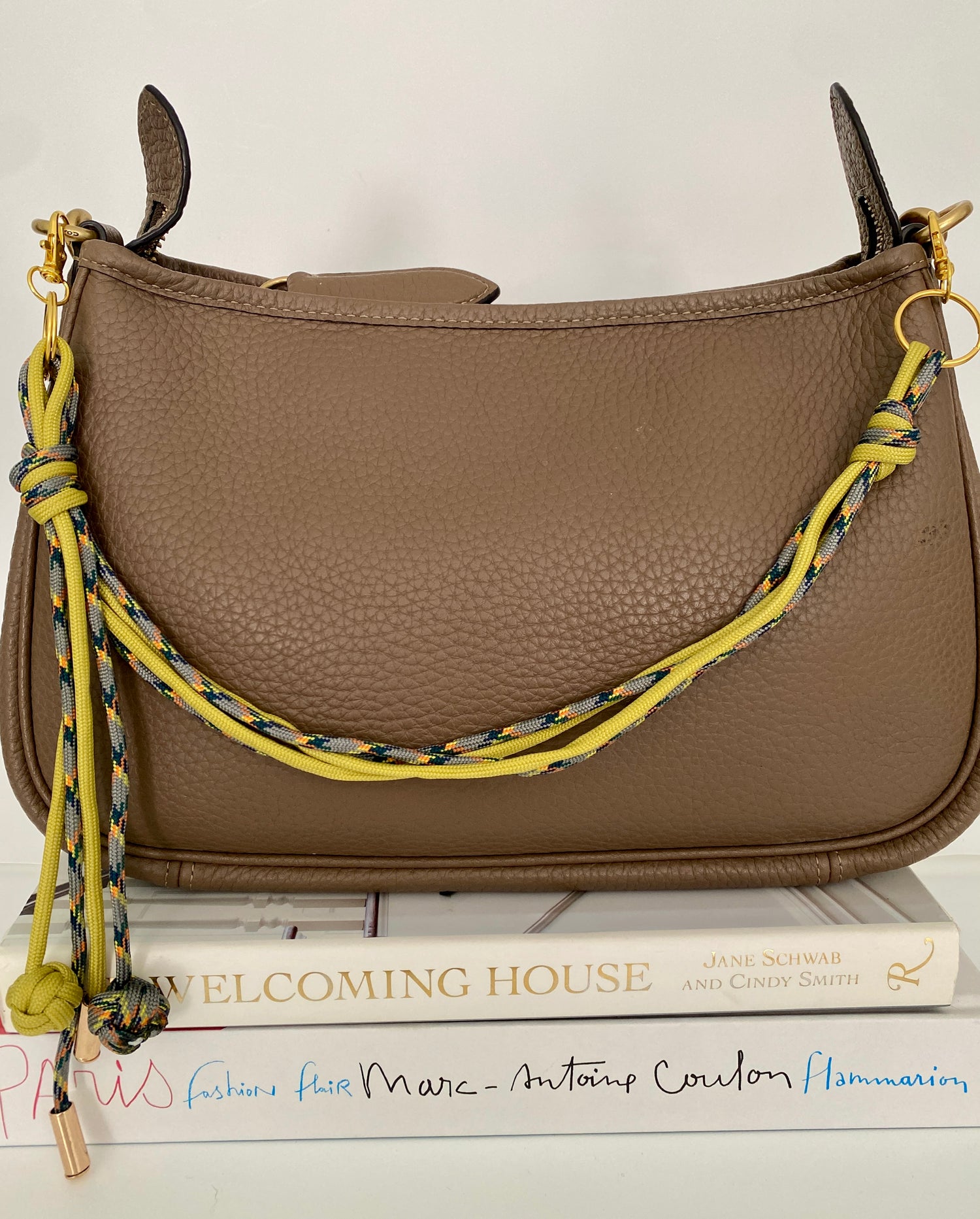 Bright braided paracord drapes across your bag strap to strap with secure hooks. Finished with a classic round knots and sleek gold caps for a playful yet polished touch.