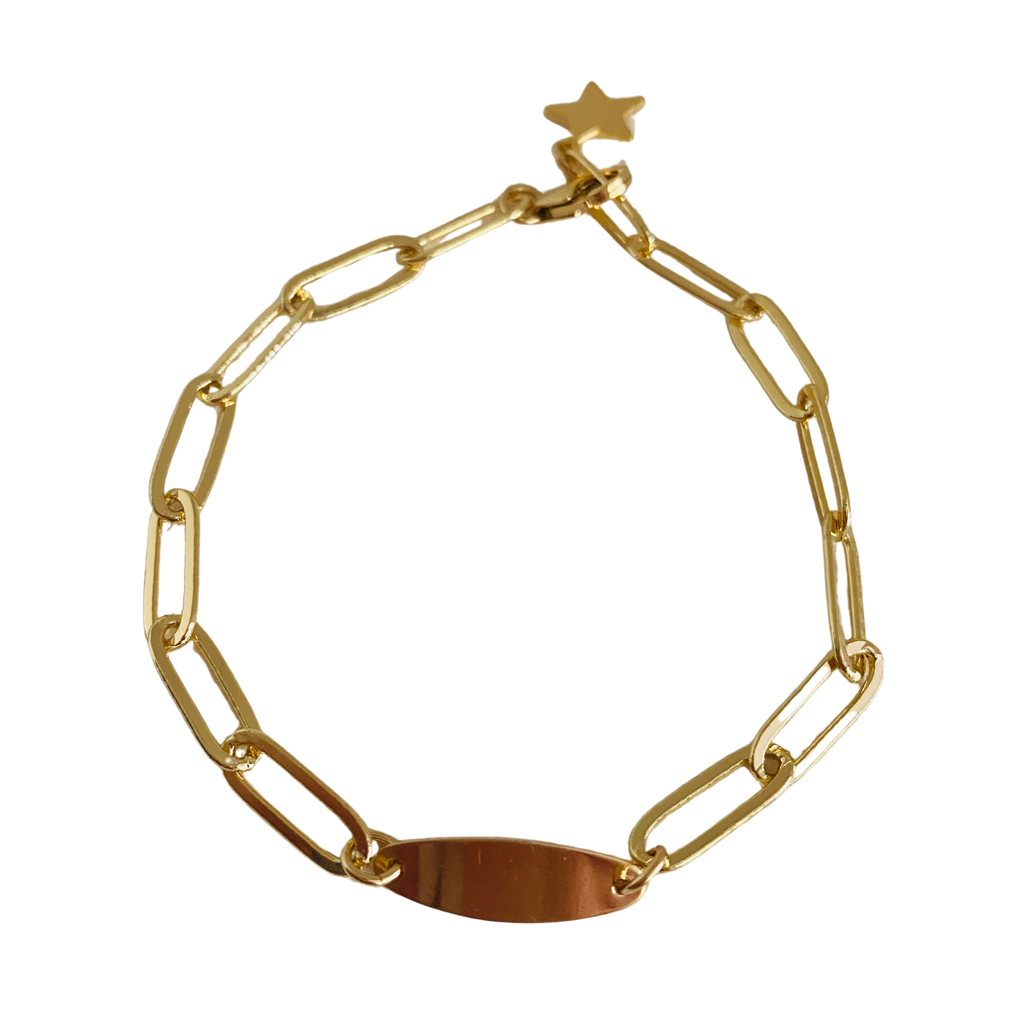 A paper clip chain bracelet with an I.D. tag enhanced with a small star charm is a sleek and modern piece of jewelry that features a bold and chunky chain, accented with a customizable I.D. tag and a small star charm.
