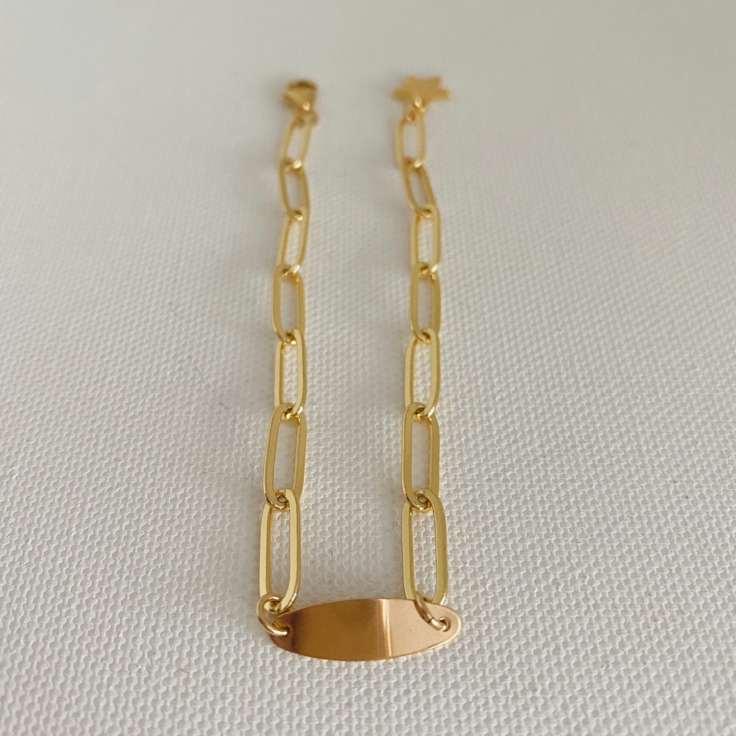 Overall, a paper clip chain bracelet with an I.D. tag enhanced with a small star charm is a bold and modern piece of jewelry that is perfect for everyday wear or as a thoughtful and personalized gift. Its sleek design and customizable elements make it a versatile and timeless piece that can be worn with a variety of different outfits and styles.