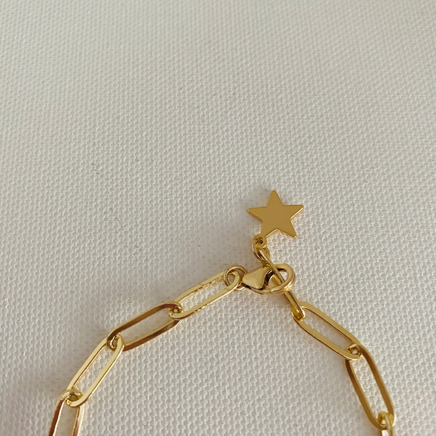 The small star charm is attached to the chain or with a small jump ring. The star adds a touch of whimsy and celestial inspiration to the overall design, while still maintaining the sleek and modern look of the bracelet.