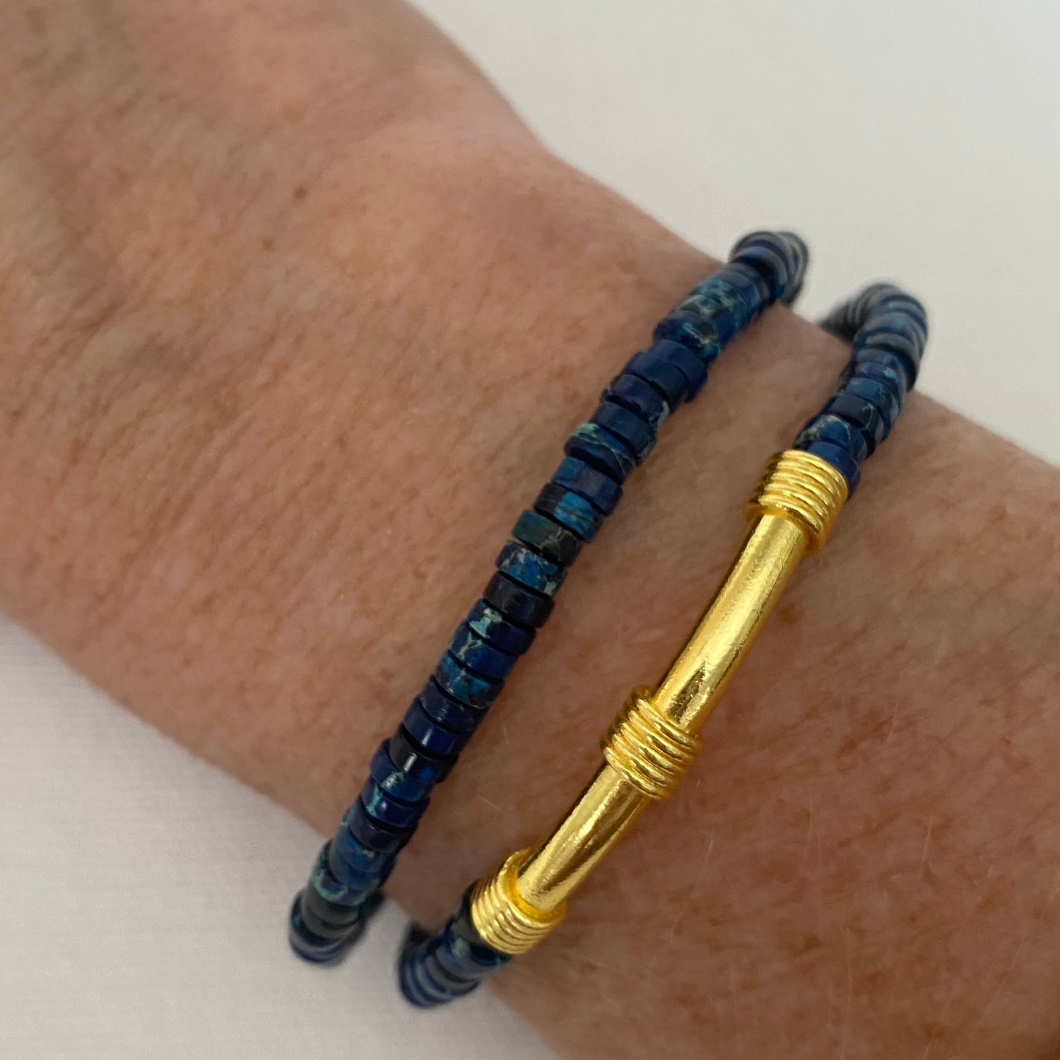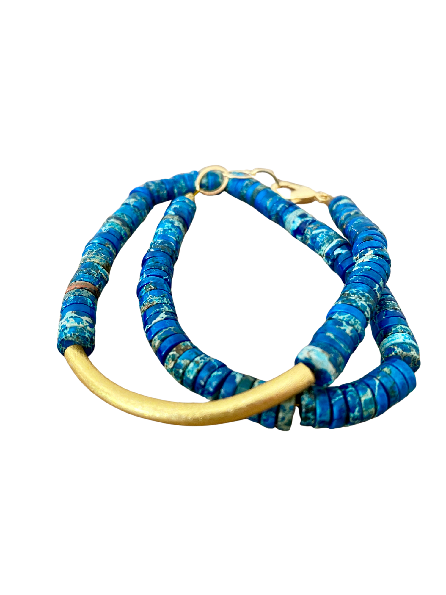Lapis-colored Heishi beads are strung together in a bracelet, that double wraps around the wrist enhanced with a stunning gold bar. The beads, with their uniform shape and captivating color, create a harmonious rhythm as they encircle the wrist, forming a seamless loop of beauty and craftsmanship measuring 14.5 inches and adjustable to a smaller size.