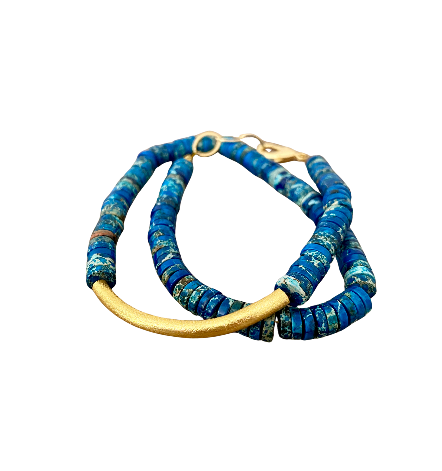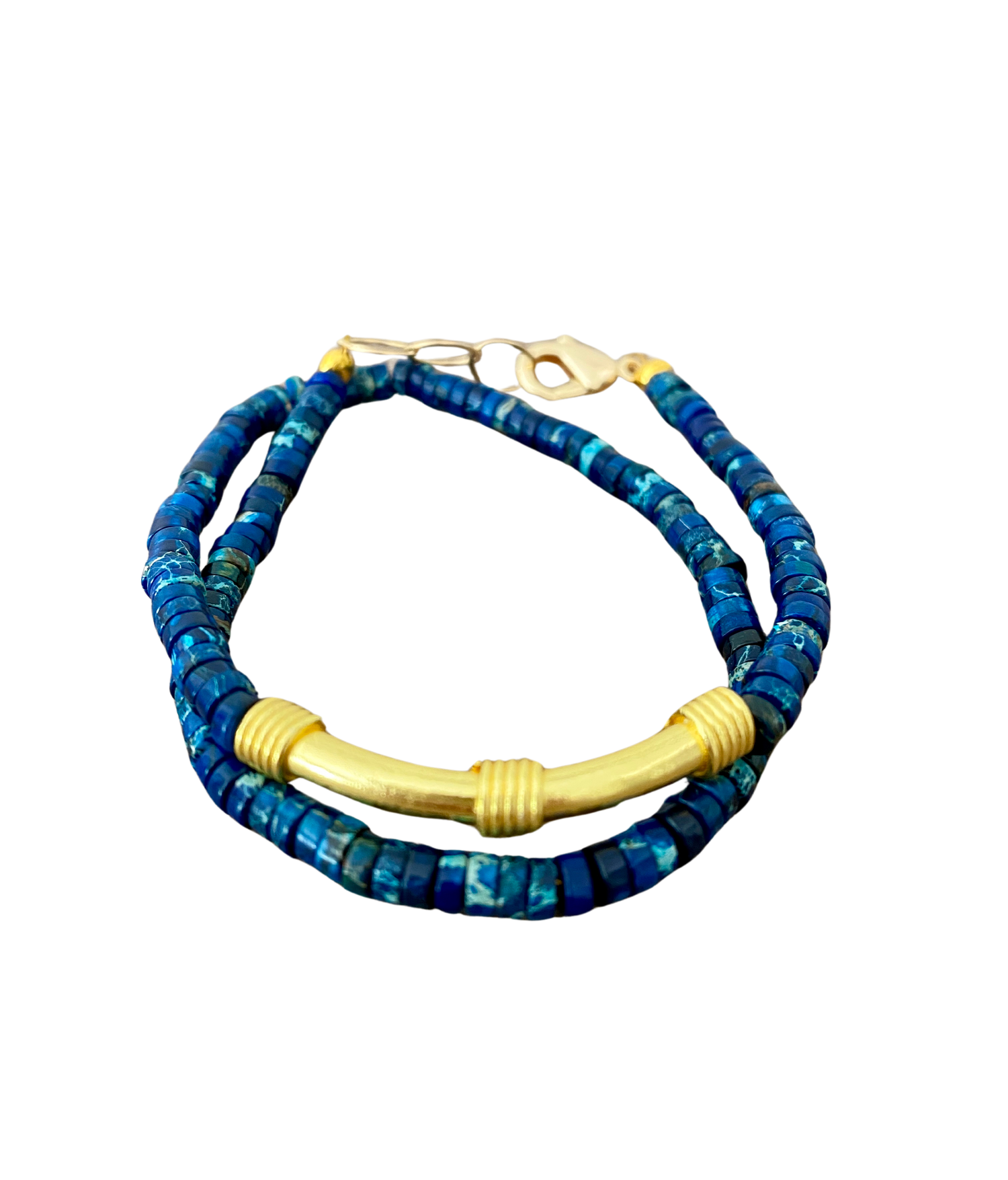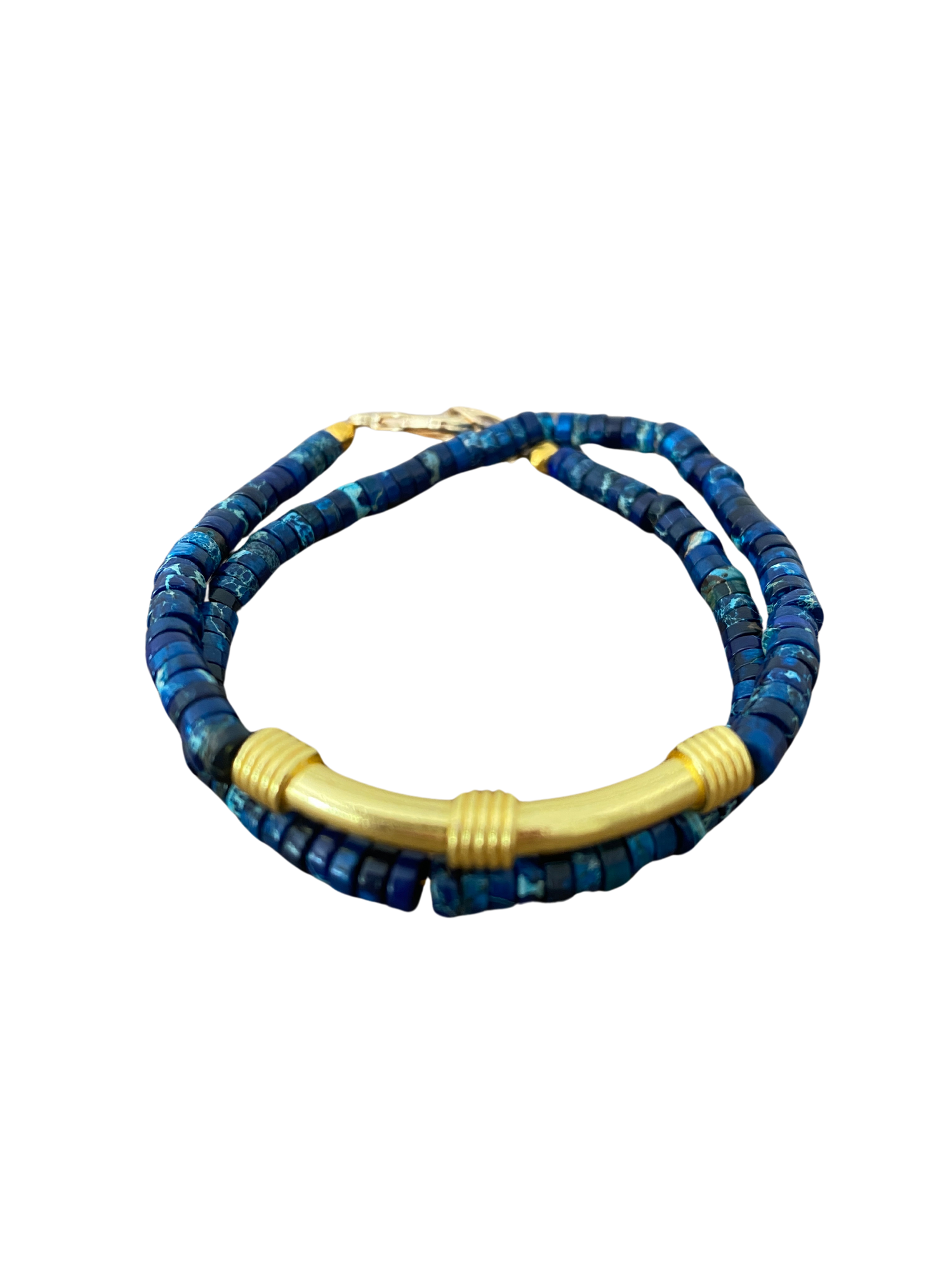 In essence, a Heishi double wrapped bracelet adorned with lapis-colored beads and a gold bar embodies a perfect blend of tradition, beauty, and sophistication—a timeless accessory that captivates with its simplicity and elegance.