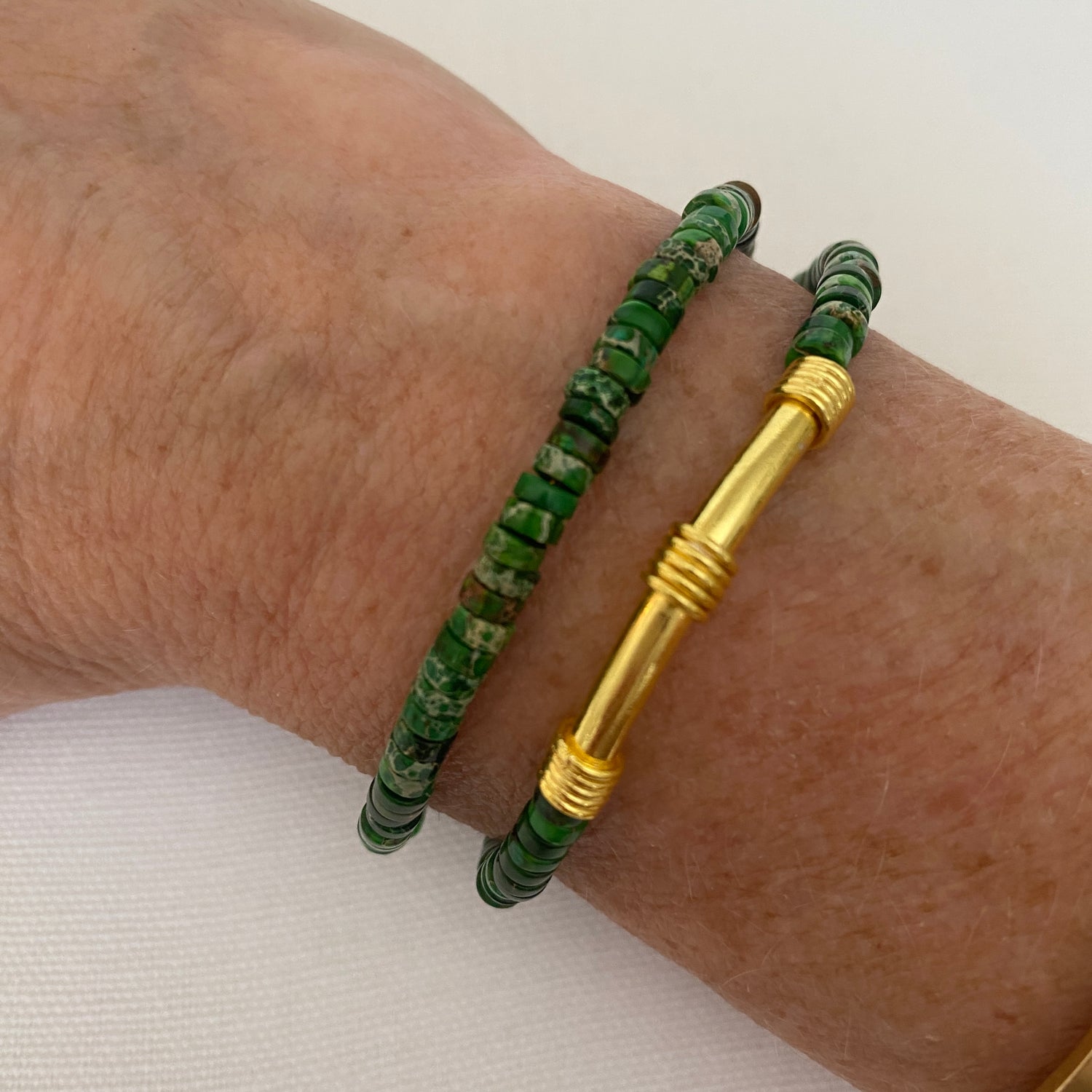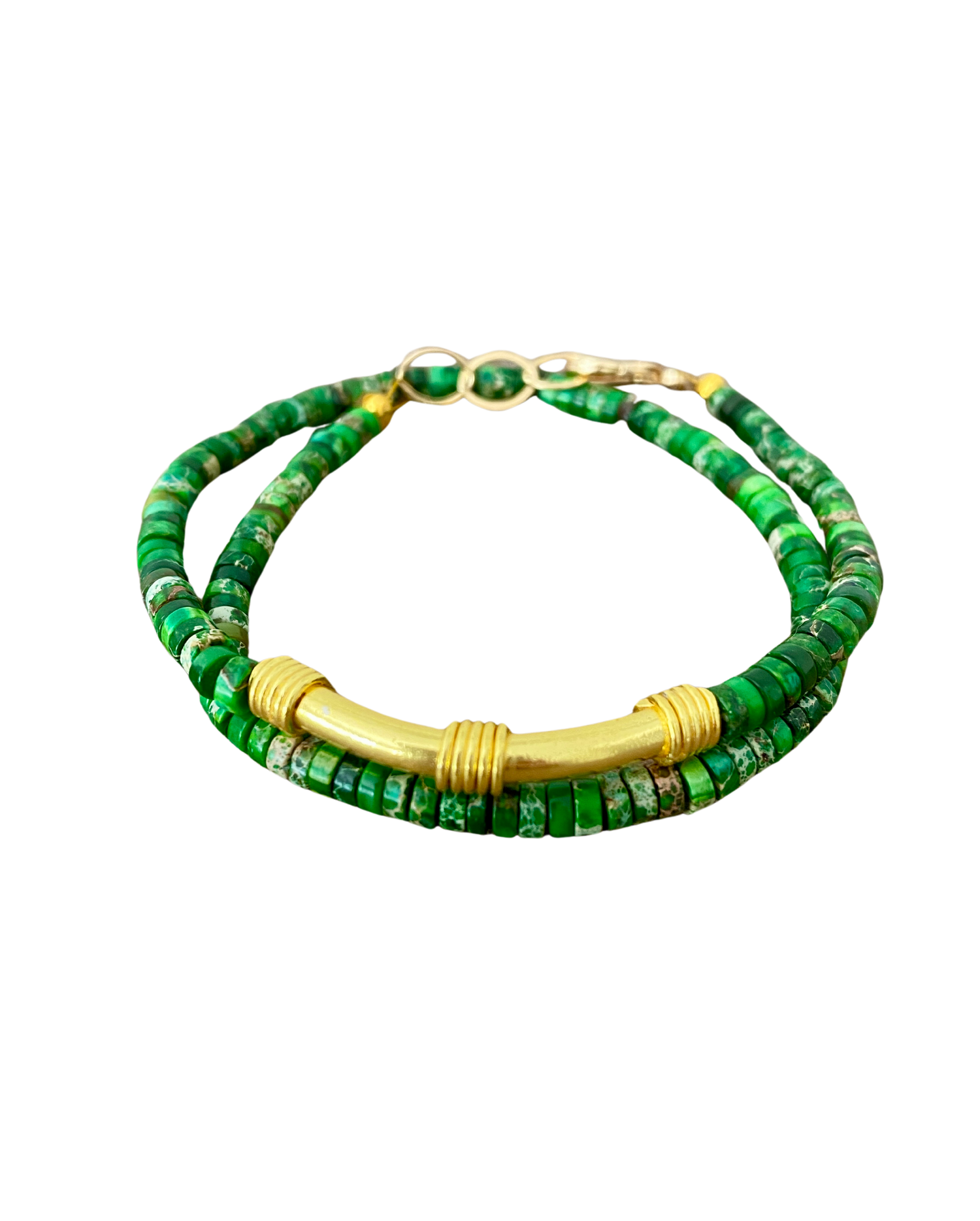 In essence, a Heishi double wrapped bracelet adorned with green-colored beads and a gold bar embodies a perfect blend of tradition, beauty, and sophistication—a timeless accessory that captivates with its simplicity and elegance.