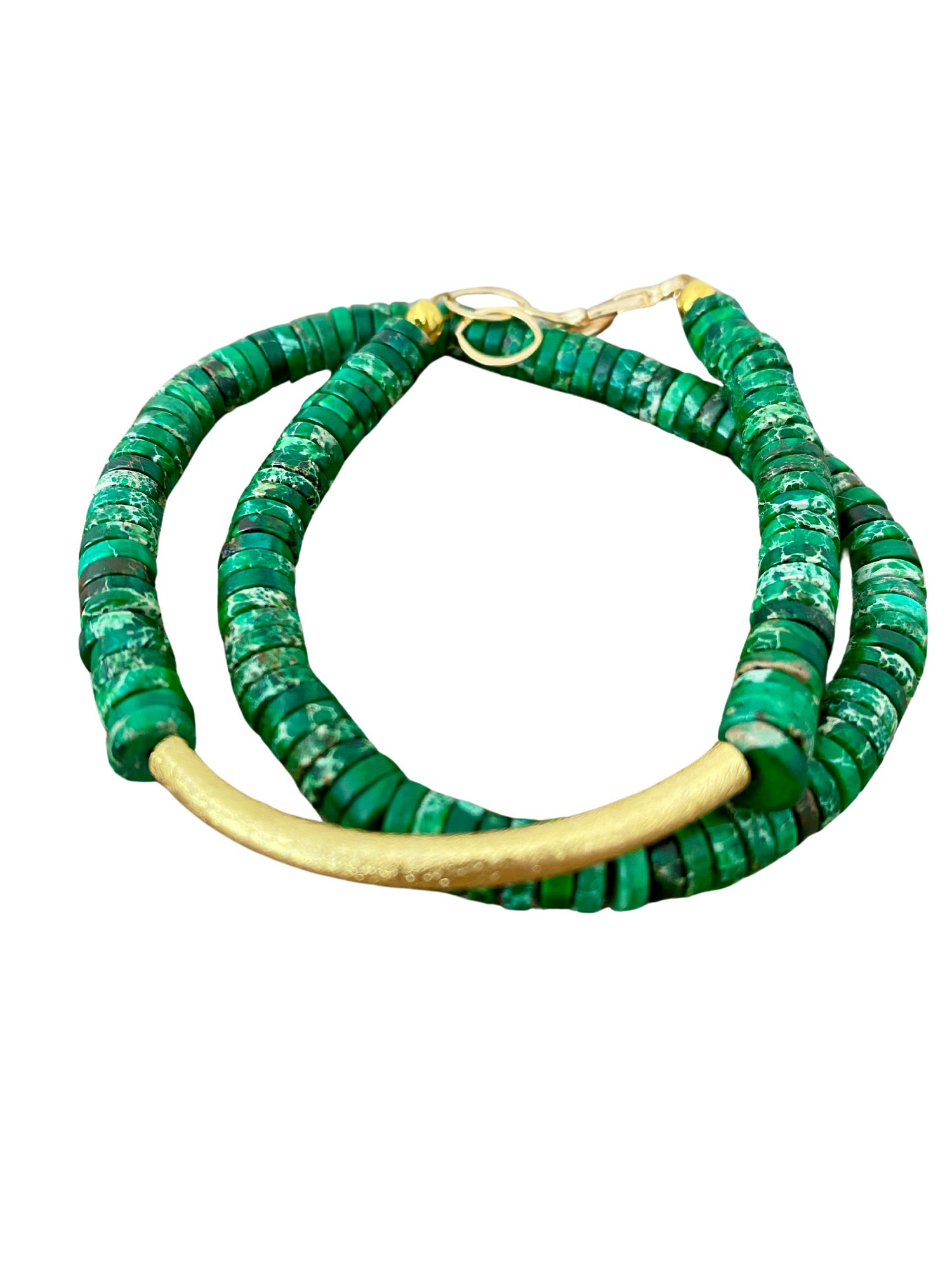 Green-colored Heishi beads are strung together in a bracelet, that double wraps around the wrist enhanced with a stunning gold bar. The beads, with their uniform shape and captivating color, create a harmonious rhythm as they encircle the wrist, forming a seamless loop of beauty and craftsmanship measuring 14.5 inches and adjustable to a smaller size.