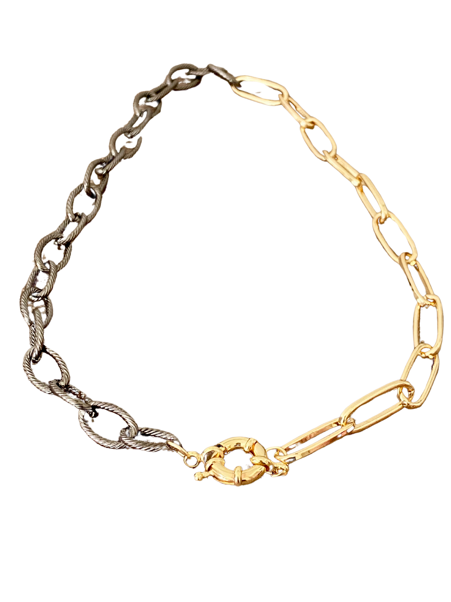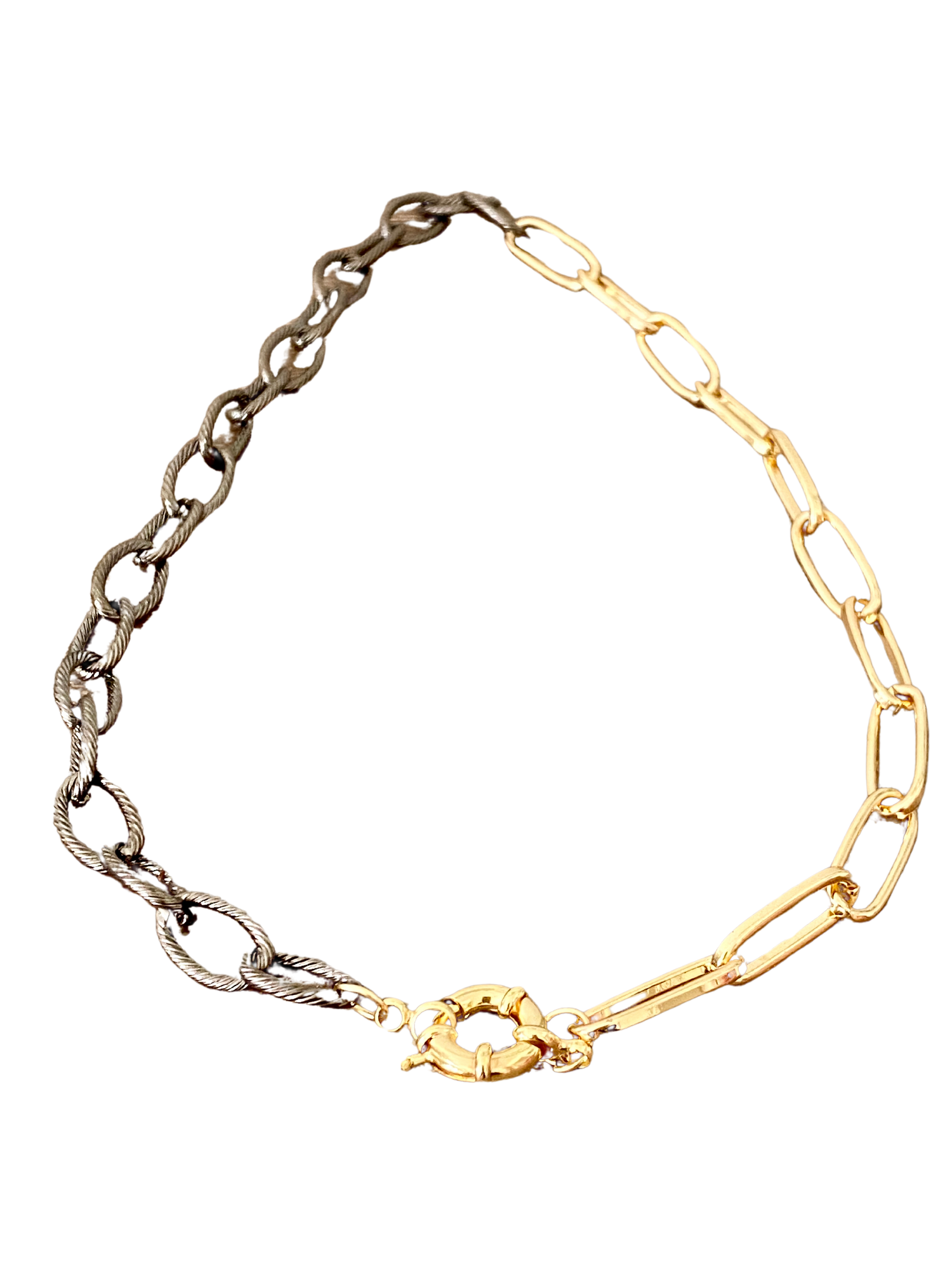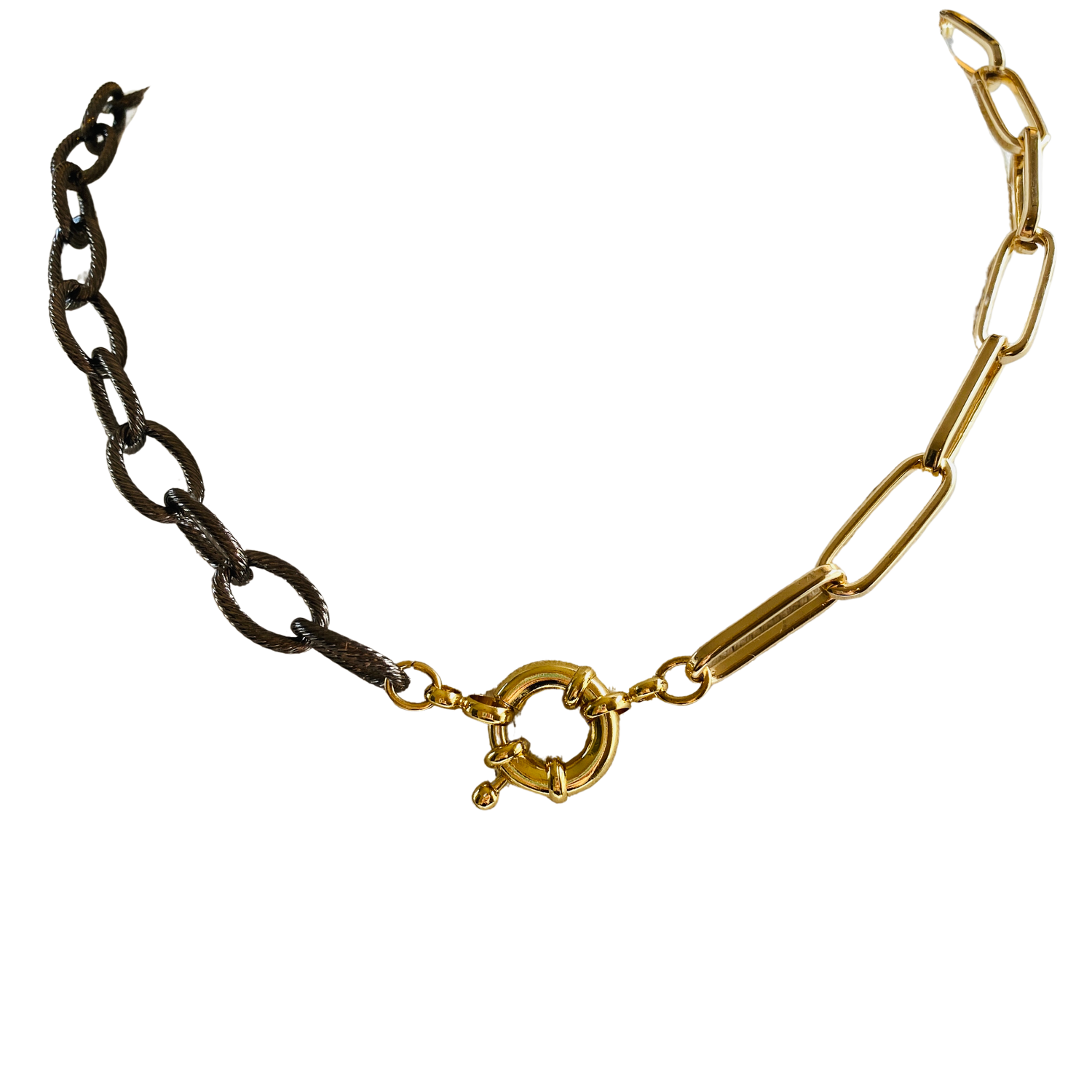 In the third look, you can mix both the gold paper clip chain and the oxidized silver chain together for a stunning contrast of mixed metals. This combination creates a visually intriguing and unique design, showcasing your fashion-forward and eclectic sense of style. The interplay of the different metals adds a dynamic and eye-catching element to the necklace, making it a statement piece that is sure to capture attention.