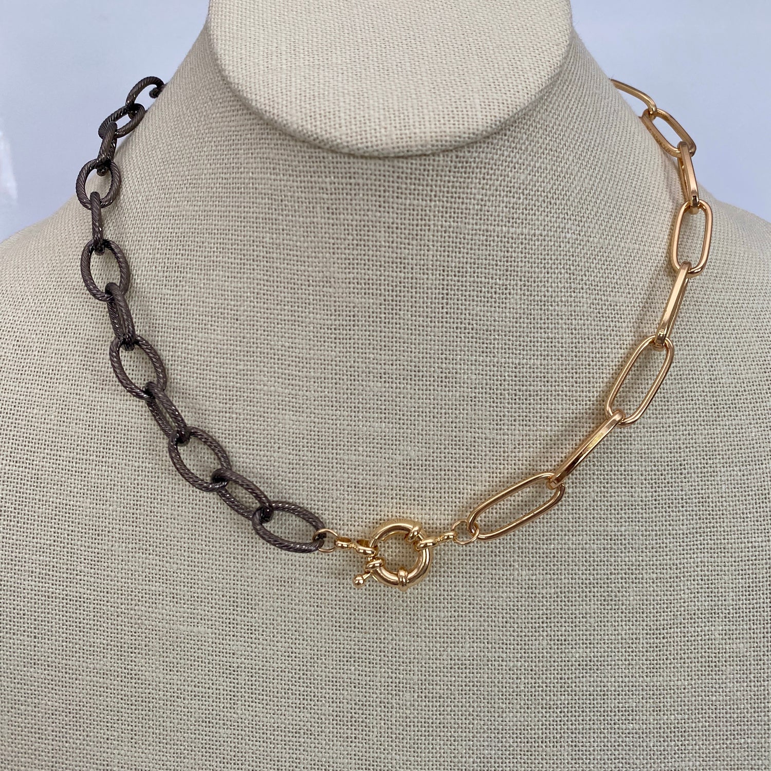 This versatile necklace offers three different looks in one stunning piece of jewelry. Crafted with a combination of mixed metals, including a gold paper clip chain and an oxidized silver chain, it is finished with a secure sailor clasp. The necklace measures approximately 17 inches in length and can be rotated to achieve three distinct styles.