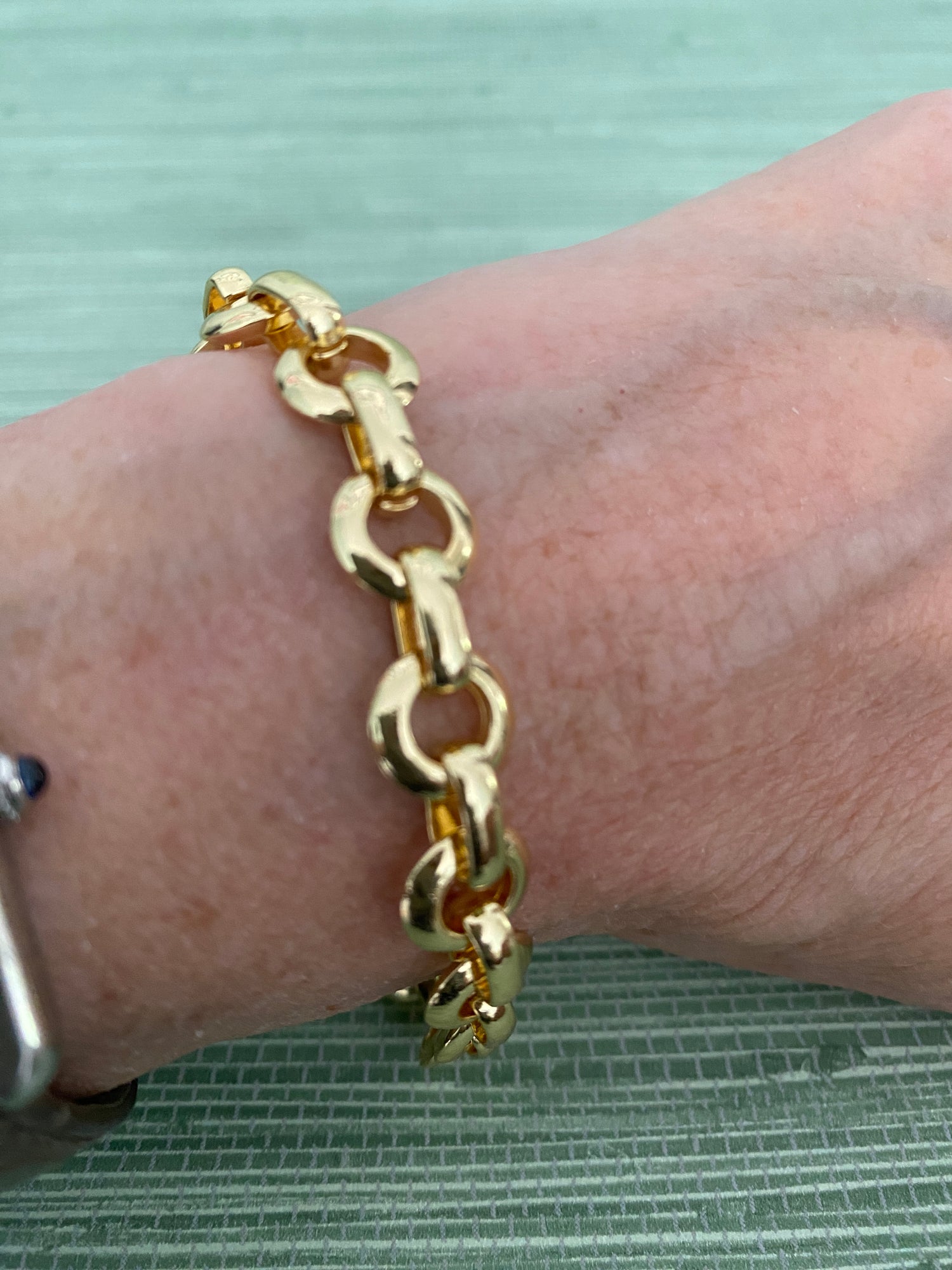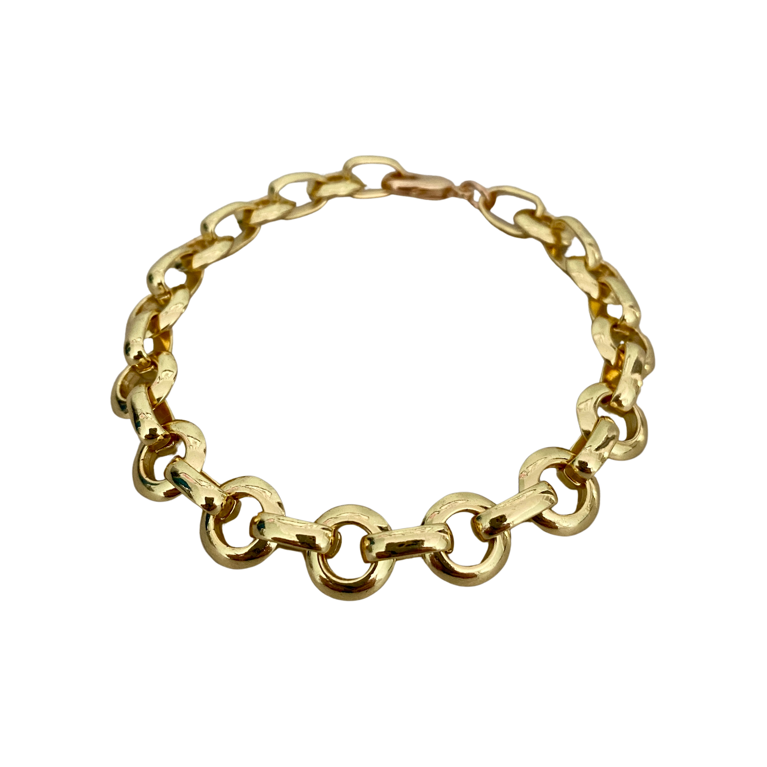 This statement bracelet features a bold, luxurious design crafted entirely from rich, gleaming gold. Substantial gold circles form the main structure, each one smoothly polished and slightly domed for dimension and shine. These circles are elegantly connected by thick oval links. A secure lobster clasp completes the piece at a length of 7.5 inches, making it as practical as it is eye-catching—a timeless accessory with modern edge.